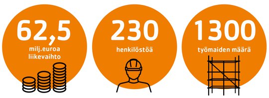Tunnuslukumme vuodelta 2024: liikevaihto 82 milj. euroa, omaa henkilöstöä 253 ja työmaiden määrä 1019.
